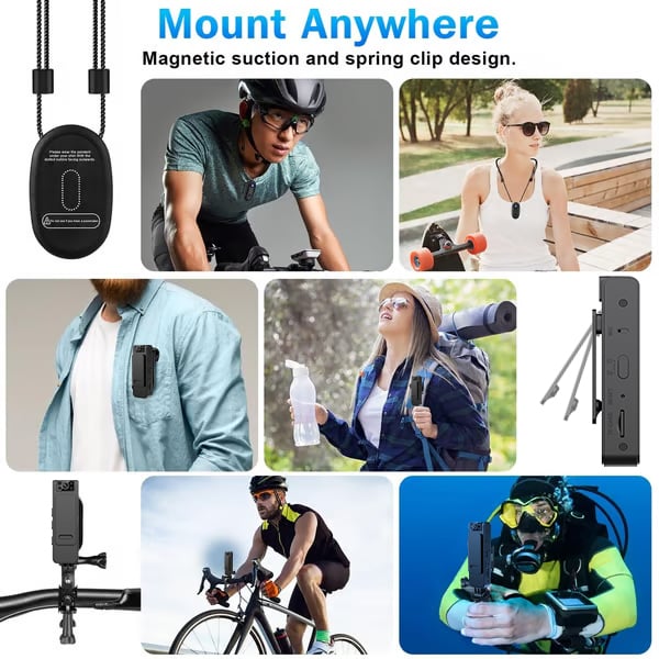 MOUNT ANYWHERE: The i3 sports camera features a magnetic design, allowing you to attach it to an Iron metal surface. It also comes with a magnetic lanyard pad that lets you quickly mount it to your chest in just one second. With a 360° rotating spring clip, you can effortlessly secure the camera to your collar, pocket, waist, and more. Additionally, it includes seven other mounting accessories, making it easy to attach to bikes, motorcycles, helmets, and other gear.